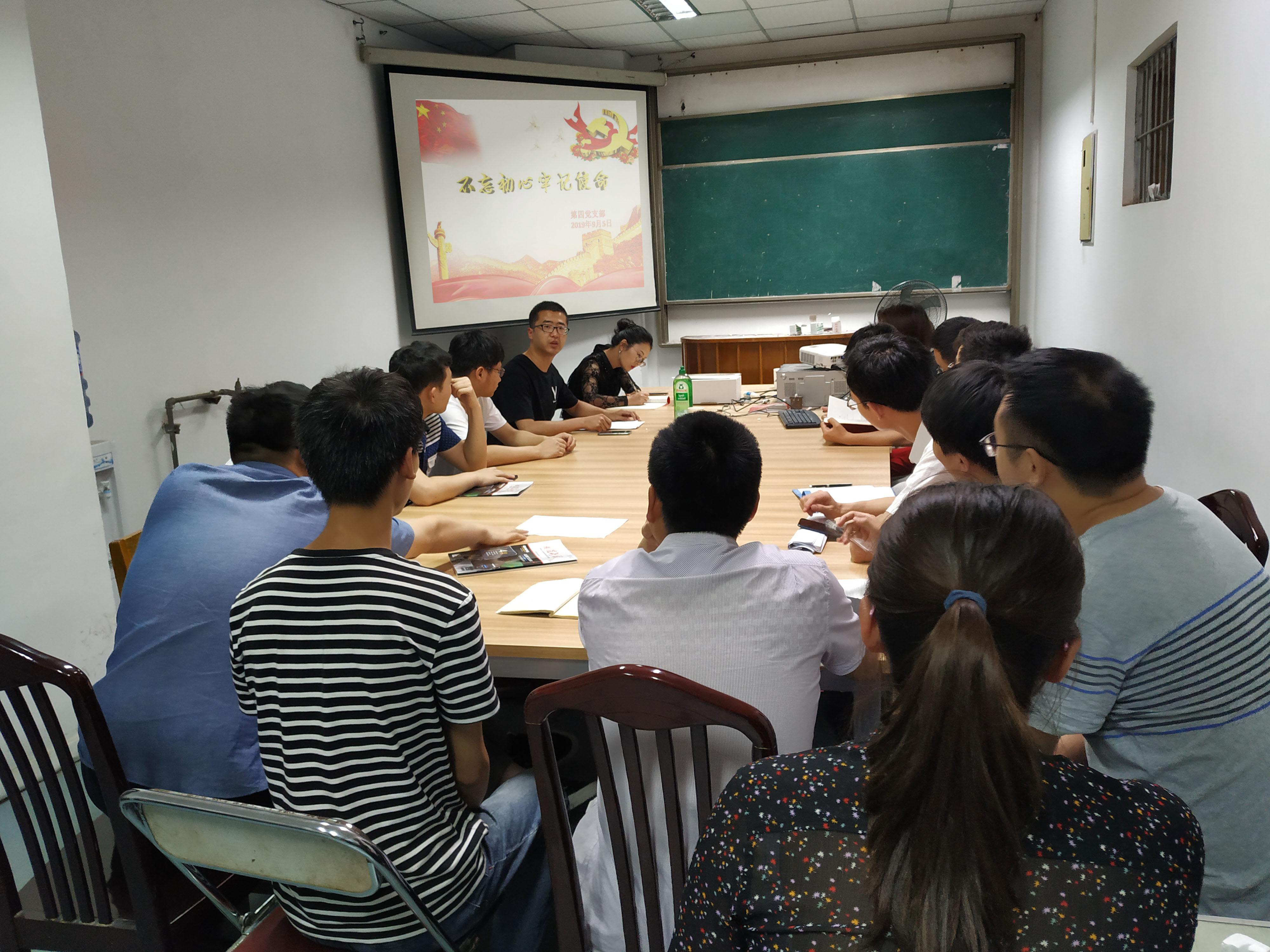 王成雨同志带领支部党员学习了习近平总书记在“不忘初心、牢记使命”主题教育工作会议上的重要讲话精神及黄文秀同志的先进事迹。大家了解到,黄文秀同志积极响应组织号召,到乐业县百坭村担任驻村第一书记,带领广大群众脱贫致富,今年6月,王文秀同志在从百色返回乐业途中遭遇山洪不幸牺牲,献出了年仅30岁的宝贵生命。王成雨同志指出,广大研究生党员和青年同志要以黄文秀同志为榜样,不忘初心、牢记使命,勇于担当、甘于奉献,在新时代的长征路上做出新的更大贡献。