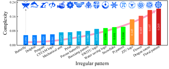 图3. 非规则图案界面复杂度的评估结果。每个色条的值对应所指示样本图案的复杂度。 |
