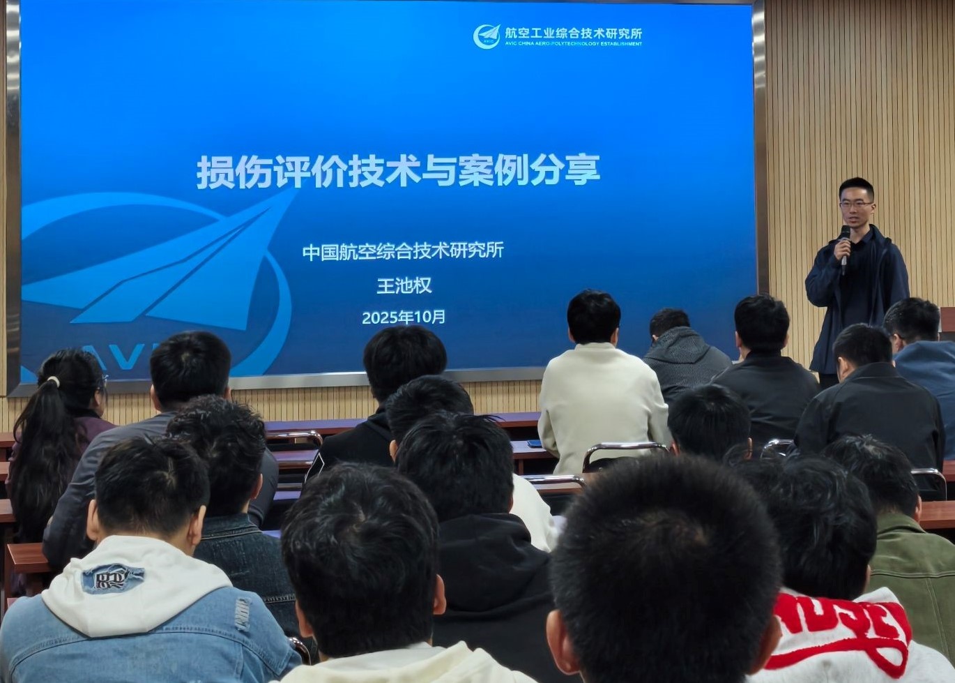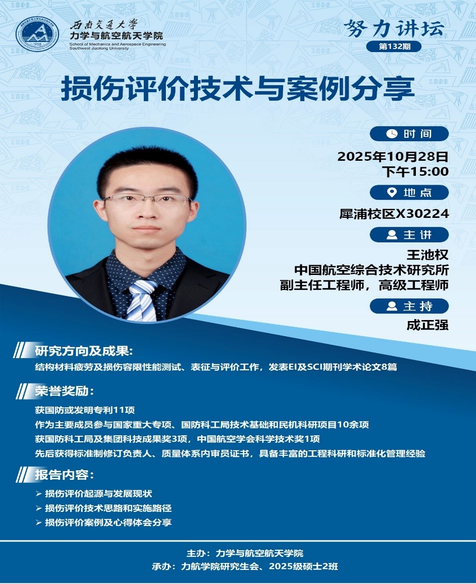 2025年10月28日,中国航空综合技术研究所副主任工程师、高级工程师王池权受邀在X30224以“损伤评价技术与案例分享”为主题开展讲座。学院部分老师、2024级、2025级研究生参与讲座。讲座由成正强老师主持。